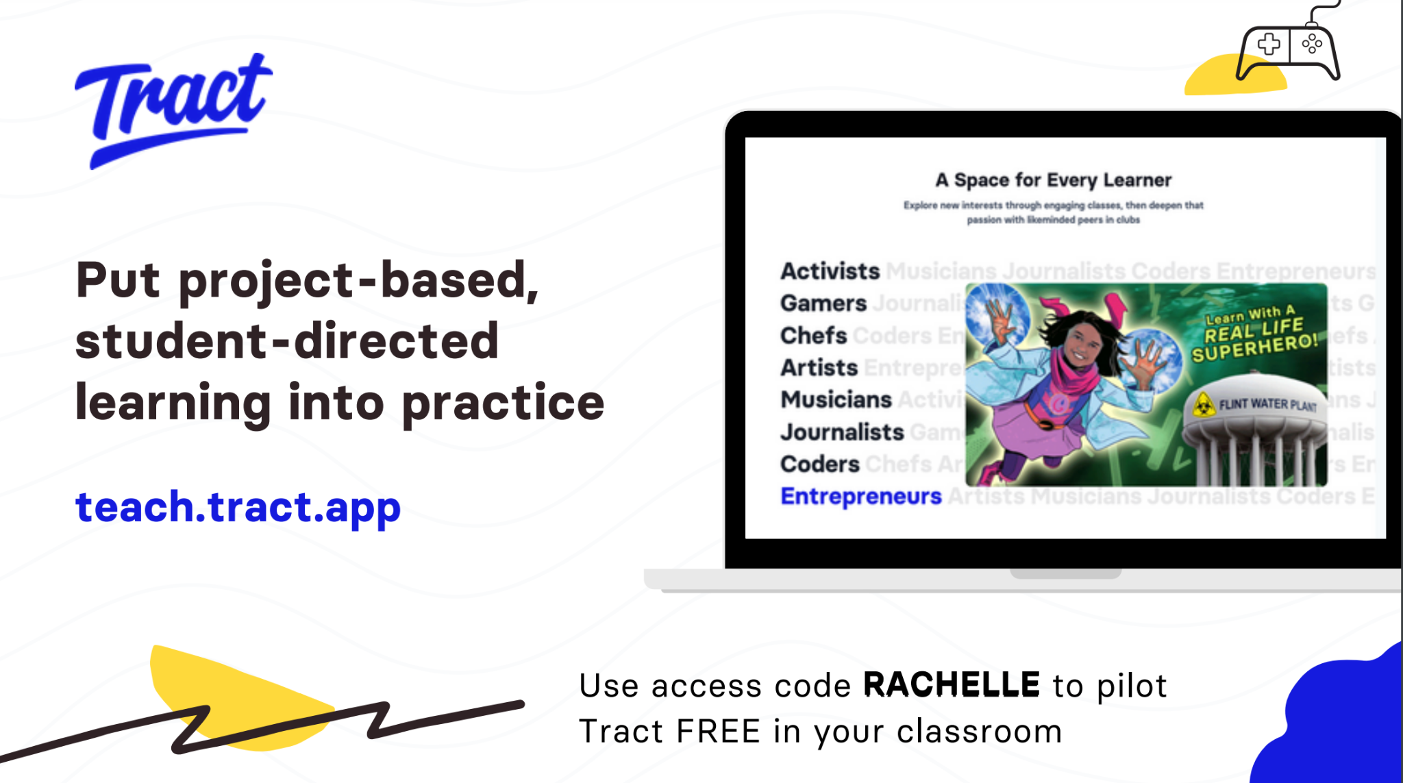 Tract is for use both at home and in classrooms around the world and the content is best for students in third through the eighth grade. All videos are reviewed and hosted on their private Vimeo server. Tract is providing its service free for the first 1,000 teachers using my code, RACHELLE, to request access at teach.tract.app. Once your account is ready, you can set up your students using a simple educator code..