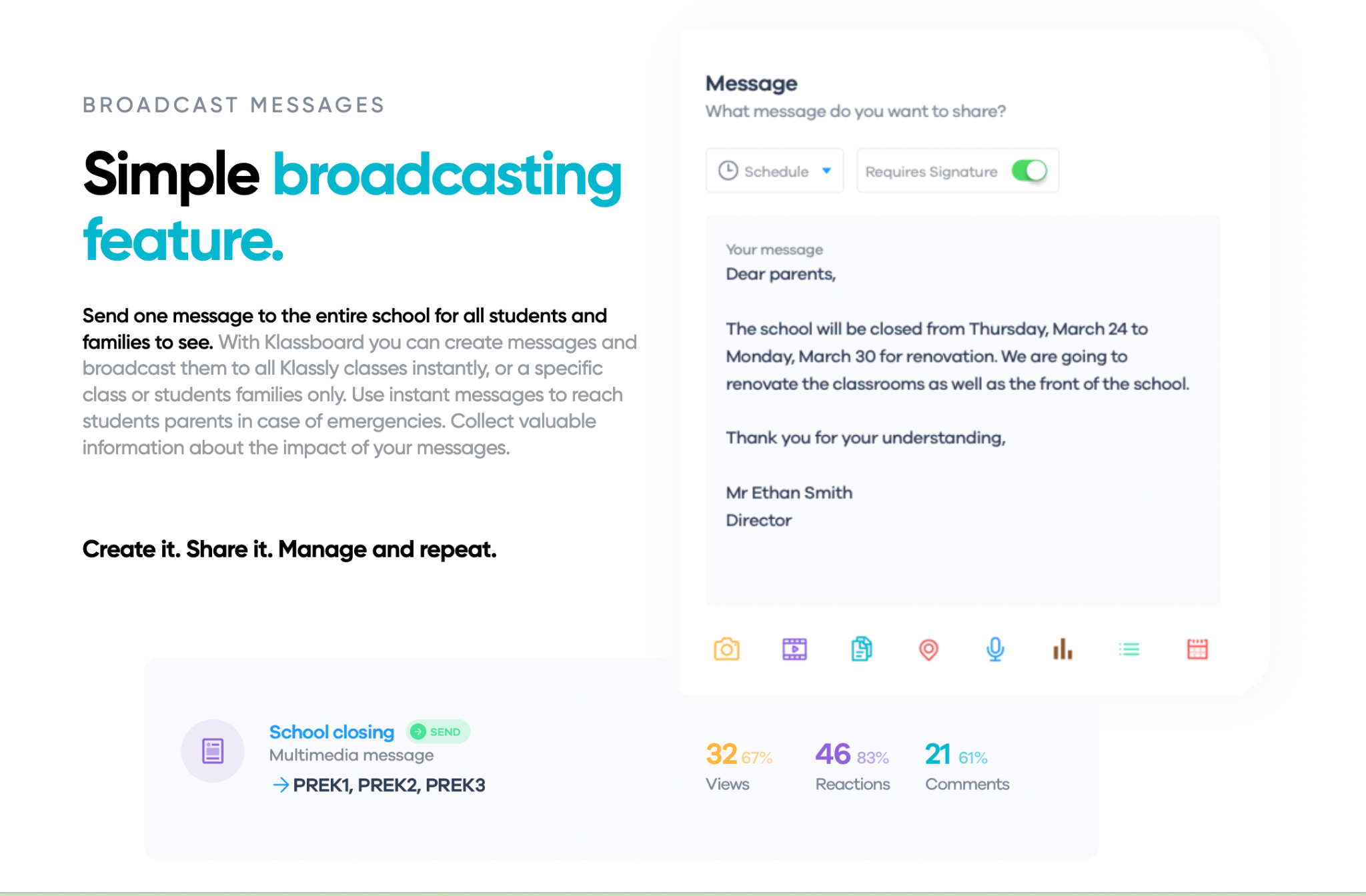With Klassboard Master (for districts) and Klassboard Pro (for Principals and school admin), messages can be broadcast to all Klassly classes (managed by teachers) instantly, or to a specific class or students’ families. Teachers and administrators can send instant messages to reach students’ parents in the event of an emergency. Through the dashboard, schools can collect valuable information about messages that have been sent, engagement data, comments, private responses, attendance records, and student information.