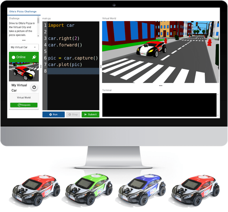 AutoAuto’s virtual car and worlds are quick to captivate students’ interest with its fun city where there are places to visit such as a pizza shop and a car wash. In the virtual city, students can go on different challenges such as the spy mission and the color hunting challenge. Using the physical and virtual AutoAuto cars, students are able to see the real ways that code can save lives, like in the pedestrian detection and avoidance project. Students really enjoy these real-world experiences!
