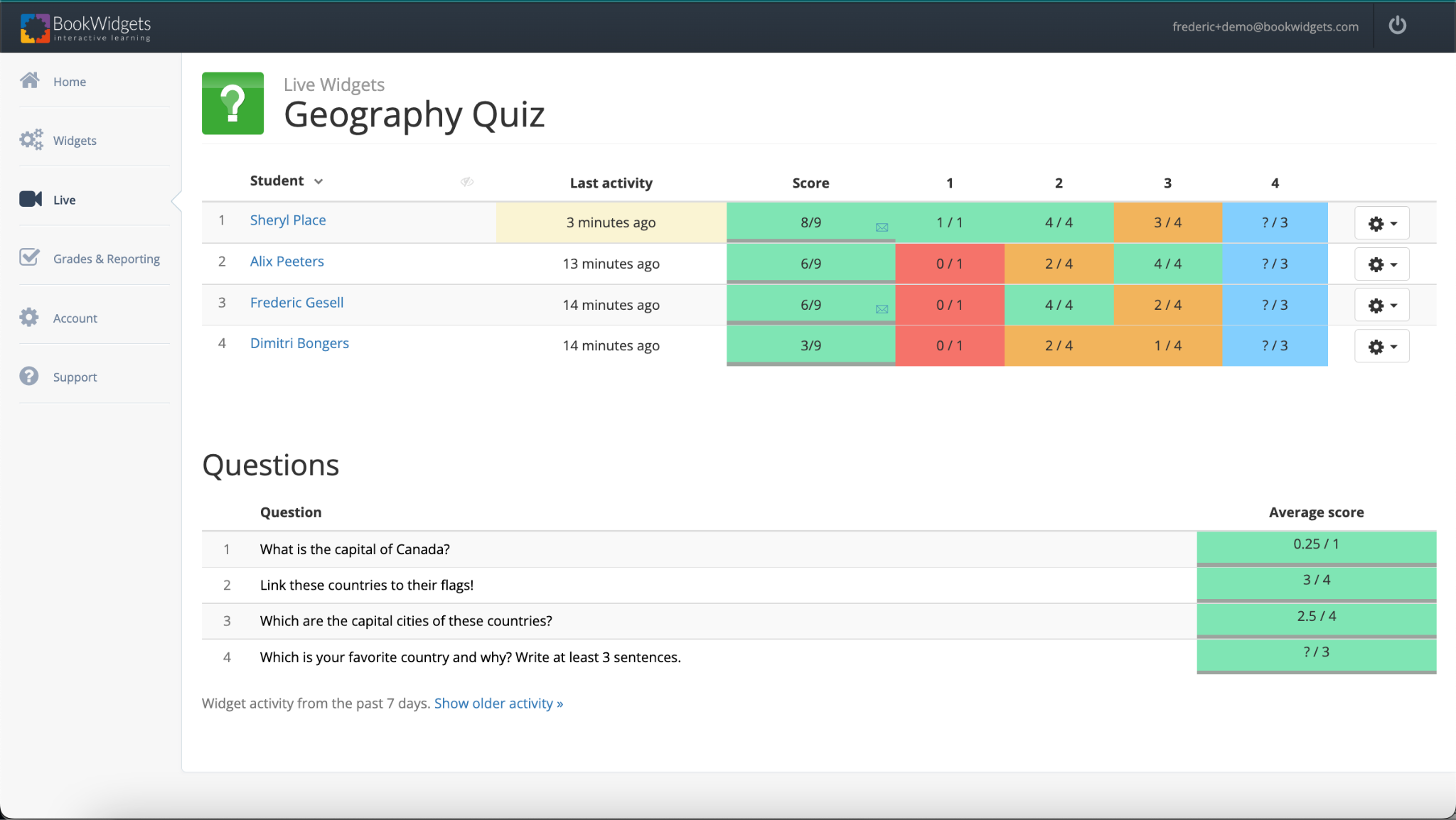 Via the Reporting Dashboard, BookWidgets offers valuable insights into student progress and performance through its analytics feature. Teachers can easily track individual and class-wide progress, identify patterns, and assess the effectiveness of their instructional strategies. These analytics enable educators to make data-driven decisions, modify their teaching methods if necessary, and provide targeted support to students who may require additional assistance.