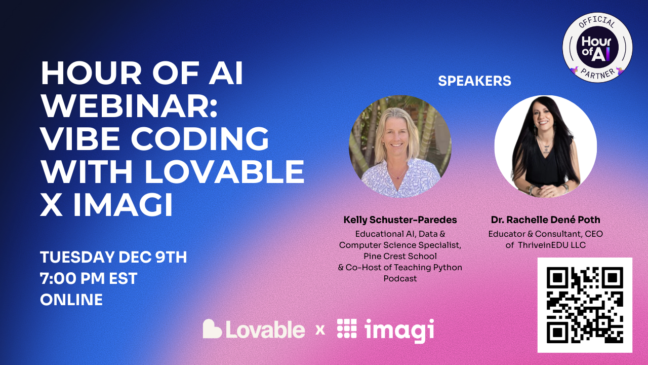 Vibe coding is the perfect activity to explore because it makes it even easier. I think about it like this: if you and your students can write a sentence, explain a concept, then you can start creating with code. Vibe coding does not require prior coding experience. Through Imagi and Lovable, there are tutorials that provide proof that anyone can learn to code and they can do so in a fun, AI-powered way. Commonly referred to as a plug-and-play, I think it is another great opportunity for the Hour of Code/AI season this year! And, to learn how to use it, join us for a great conversation and demo!