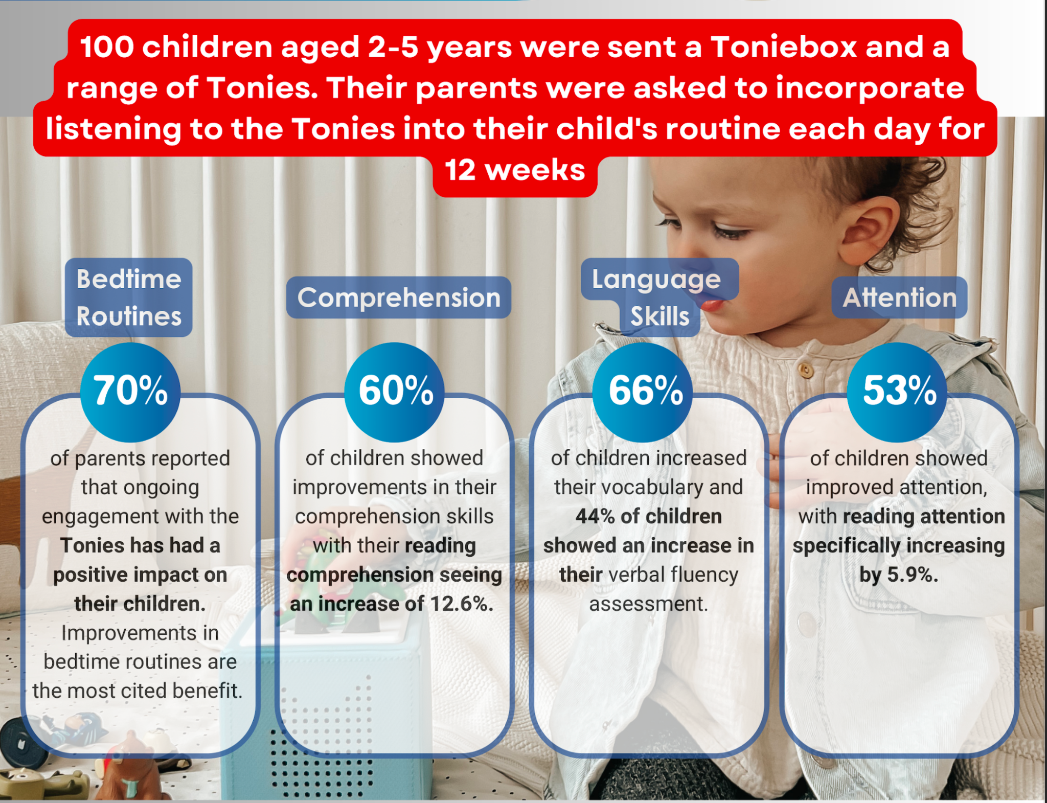 - Focus and Attention: The variety of narratives and how the Tonies create a more engaging audio experience helps children as they develop their ability to focus and concentrate. They become drawn into the stories, develop close listening skills, and get excited to share what they learn.