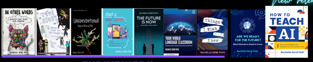 She is the author of nine books including ‘In Other Words: Quotes That Push Our Thinking,” “Unconventional Ways to Thrive in EDU,” “The Future is Now: Looking Back to Move Ahead,” “Chart A New Course: A Guide to Teaching Essential Skills for Tomorrow’s World, “True Story: Lessons That One Kid Taught Us,” “Things I Wish […] Knew” and her newest “How To Teach AI” is available from ISTE or on Amazon.