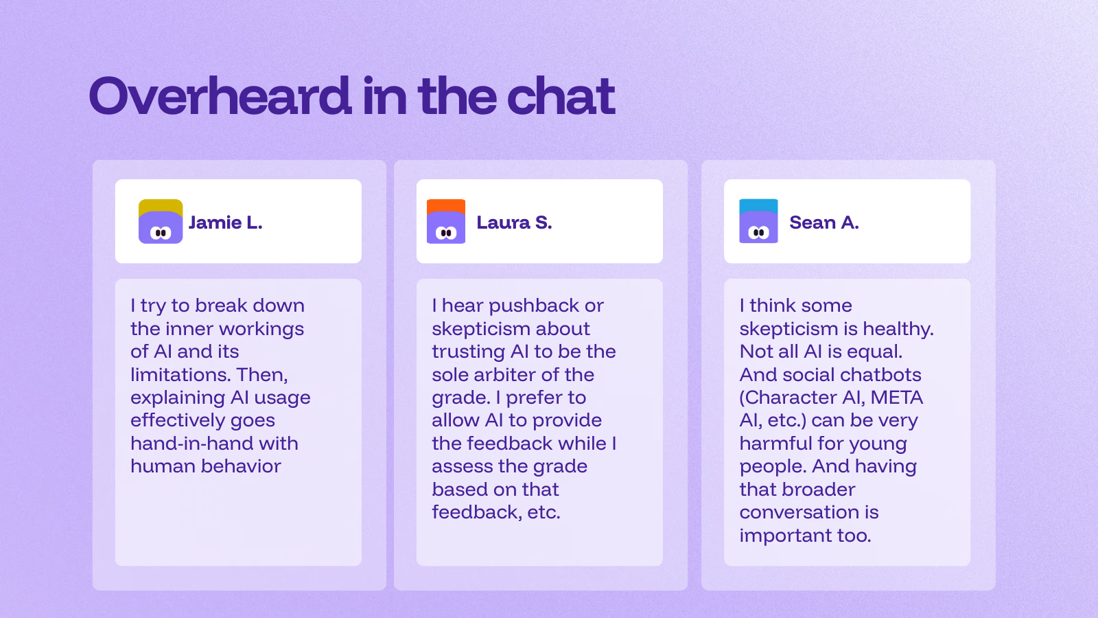 We started our discussion with what we called initial skepticism. Many teachers are hesitant to introduce AI into their classrooms, schools, or even their own workflows. As Jeff Bradbury put it: