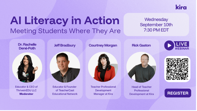 Getting started is easy. Kira offers ready-to-use courses, including AI Demystified for students, answering the big questions, “What is AI? What is it doing? How do I use it responsibly?”—and AI 101 for Educators, which builds teacher AI literacy. Looking to be part of a learning community?