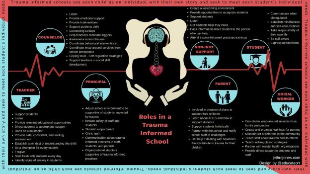 The image above is a powerful way to make sure that people know their role is in a school that is trauma informed. Get a printable version here that you can use as a handout.
